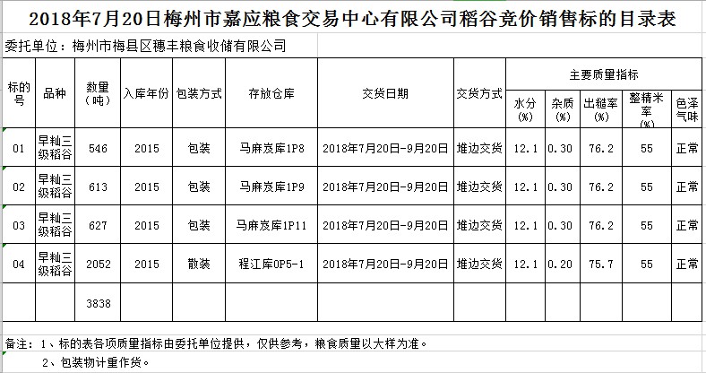 受客戶委托,梅州市嘉應(yīng)糧食交易中心有限公司定于2018年7月20日(星期五)舉辦糧食競價(jià)交易會(huì),梅州市梅縣區(qū)穗豐糧食收儲(chǔ)有限公司擬銷售早秈稻3838噸。